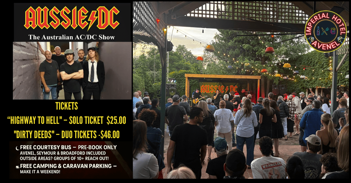 ✨ Event Details ✨📅 Saturday, Dec 21, 2025 | ⏰ Doors 7:30 PM, Show 8:00 PMTicket Types: "Highway to Hell" – General Admission ticket - $25.00🎶 General Admission – Rock Solo! 🎶 Get your single-person entry to the ultimate rock show!"Dirty Deeds" – Duo Tickets - $46.00Bring a mate and double the fun – grab 2 tickets together for just $23 each! Perfect for you and your concert wingman to sing, shout, and rock out all night long. 🤘🔥🍽 Reserve your dinner table – limited spots available.🚌 Free Courtesy Bus – Avenel, Seymour & Broadford included. Other surrounding areas available on request (minimum 10 people).🎟 Free camping available – stay the night after the show.📸 In-store photo-booth – capture your instant Rock’n’Roll memories (paid add-on).🎫 Limited tickets – grab yours now before they sell out!⚡ For those about to rock Avenel – Aussie DC salutes you!