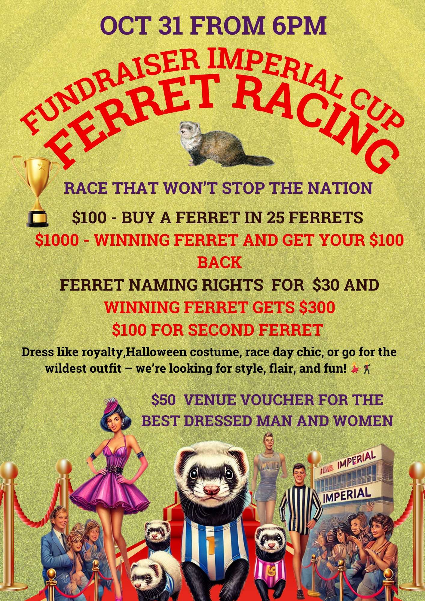 Get ready to cheer, laugh, and maybe even win big at The Imperial Cup Ferret Races, proudly supporting the Avenel Swans Junior Football & Netball Club! 🦒❀️🀍