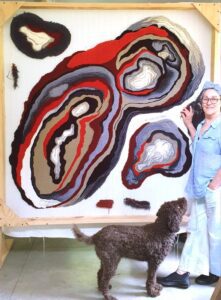 Her latest venture takes traditional tufting—learned during the Covid lockdowns to keep her mind and body engaged—and reimagines it as abstract carved rug wall hangings inspired by agate and geode rock forms. These tufted woolen pieces, best experienced in a gallery setting, have introduced her work to new audiences, expanding her creative legacy.